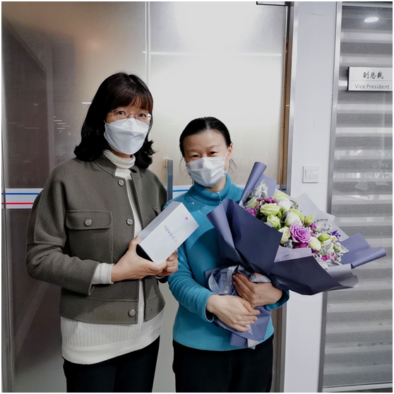 为感谢小廖姐的先生为财务统计工作所做出的贡献,彩姐特别将财务部的创新基金以其先生的名义送出这份女神节超级大礼。小廖姐从彩姐手中接过鲜花和华为NOVA6 5G手机,沉浸在这突如其来的幸福和喜悦中……