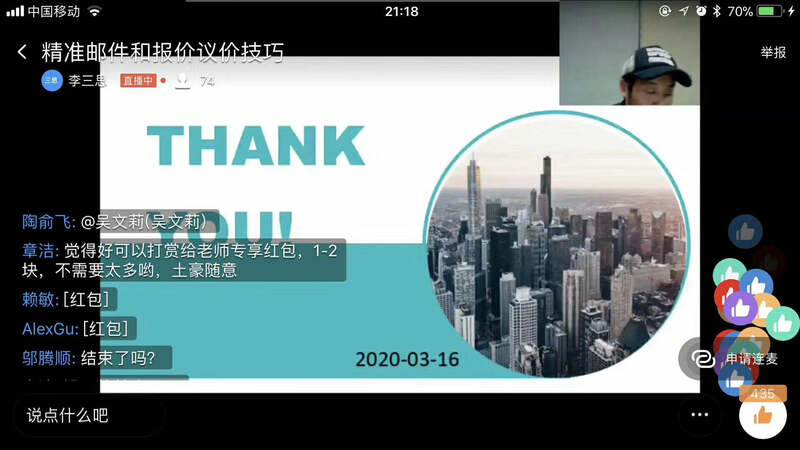 3月21日,赛尔学院终于迎来了第一节直播课程《精准邮件和报价议价技巧》。开课之前,讲师依次点名。课堂上,讲师时而进行互动、时而分享小故事,同学们都积极回应,踊跃表达自己的看法,成功带动了课堂氛围。同时,也有很多同学给讲师直播打赏,打赏金额虽然不大,但对讲师却是莫大的肯定与鼓励。