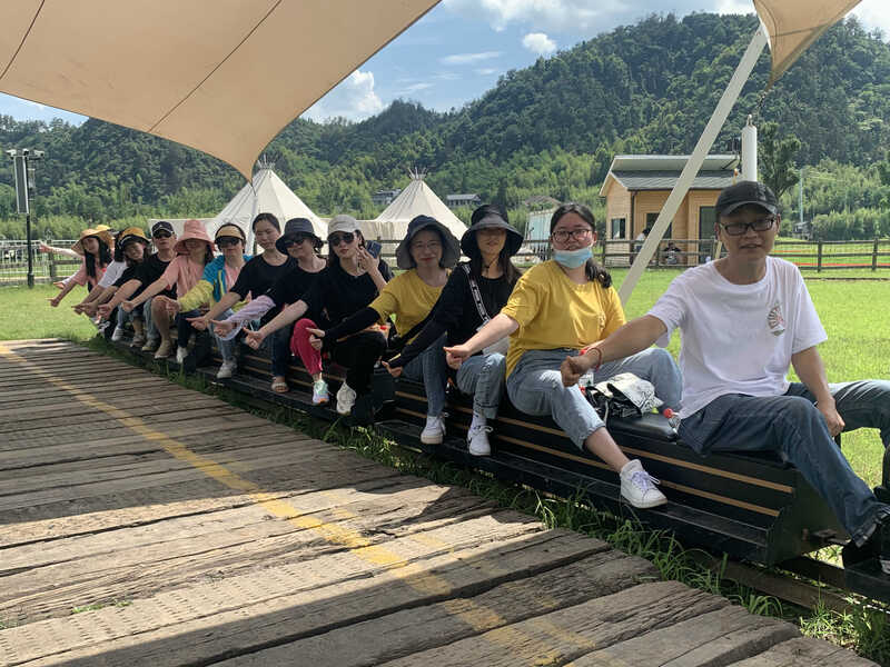 历经三个半小时的车程,宁波、义乌两地的小伙伴们终于胜利会师。短暂休整后,满血复活的我们雄赳赳气昂昂地奔赴风之谷户外乐园。此时正值一天之中最热的时辰,但纵使顶着这般艳阳,我们仍兴致不减。烂熟于心的《天天向上》BGM一响起,大家便默契地随着音乐跳起手势舞来。接下来是自由活动时间,我们坐上小火车,伴着鸣笛声徜徉花海,眺望远山。驾驶着新西兰卡丁车,感受快速俯冲的乐趣;去坡上滑草,穿梭于绿意田园之际;系紧救生衣,体验水陆两栖车的颠簸摇摆……若还觉着不够惊险刺激,何不去弹簧飞人项目体验一把失重的眩晕感?