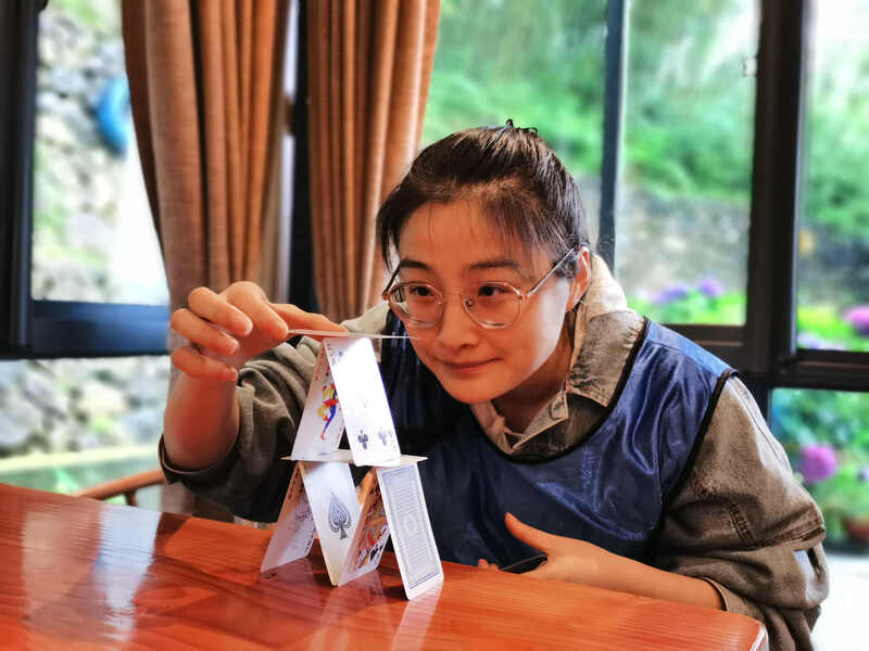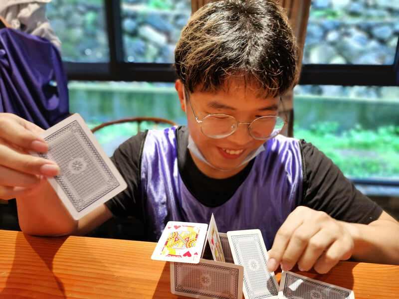 尽管天公不作美,却丝毫没有影响大家的心情。入住别墅稍事休息后,吹乒乓球、叠纸牌和猜纸卡的小游戏开始点燃了大家的胜负欲。