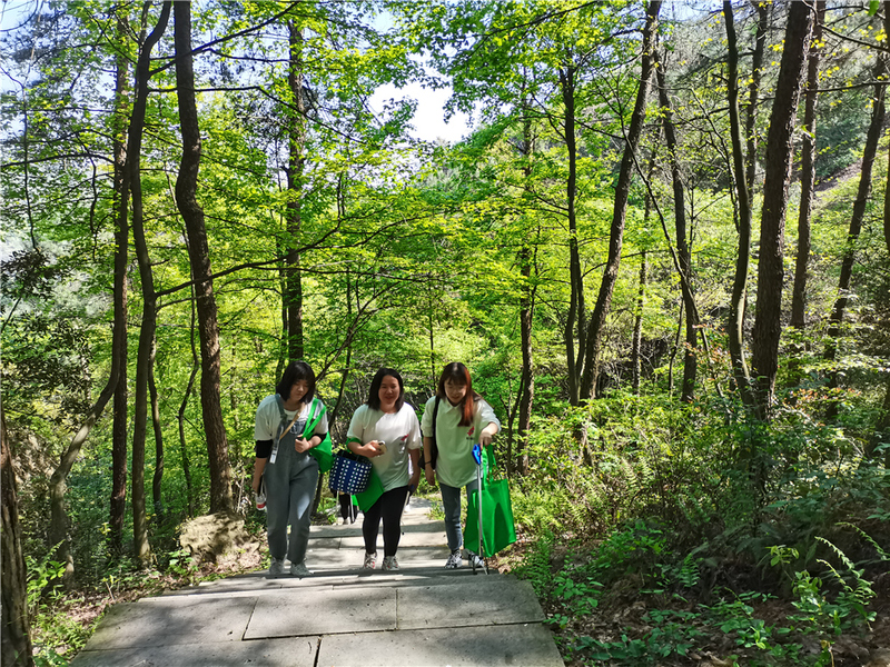 一路上,大家有说有笑,别有风趣。到达目的地后,大家沿着青石步道边走边聊,一边呼吸着山中清新空气,一边将被粗心路人遗漏的垃圾统统收入“袋”中。山上迎面走下来一位大哥,对着我们竖起了大拇指,路人的赞赏更加坚定了我们做公益的决心。