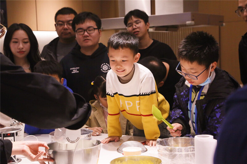 大伙儿满怀期待,早早地到达集合地。在蛋糕师一轮耐心的实操教学后,大家迫不及待来到厨台前进入DIY环节!平时在行行代码间修正bug的IT小哥哥们,穿上围裙后摇身成为米其林糕点师。60克牛奶,60克白糖,60克低粉,6个鸡蛋…若干材料混合在一起,变化为面包坯原料。蛋糕制作中最重要也是最难的步骤是将蛋黄制作成蛋糊的乳化过程,但这也难不倒技术部的小哥哥小姐姐们,发挥理工科对精确性的把握,打蛋机手法和对时间的把控令人啧啧称奇,不一会儿蛋糊就变得浓郁绵密,指导老师也对大家的成果赞不绝口。烤箱上下175度,烘培20分钟,一块块香喷喷的面包坯就烤制完成,金黄色的蛋糕早就让小朋友们都垂涎三尺。最后,奶油和水果粒组合定型,蛋糕完成。