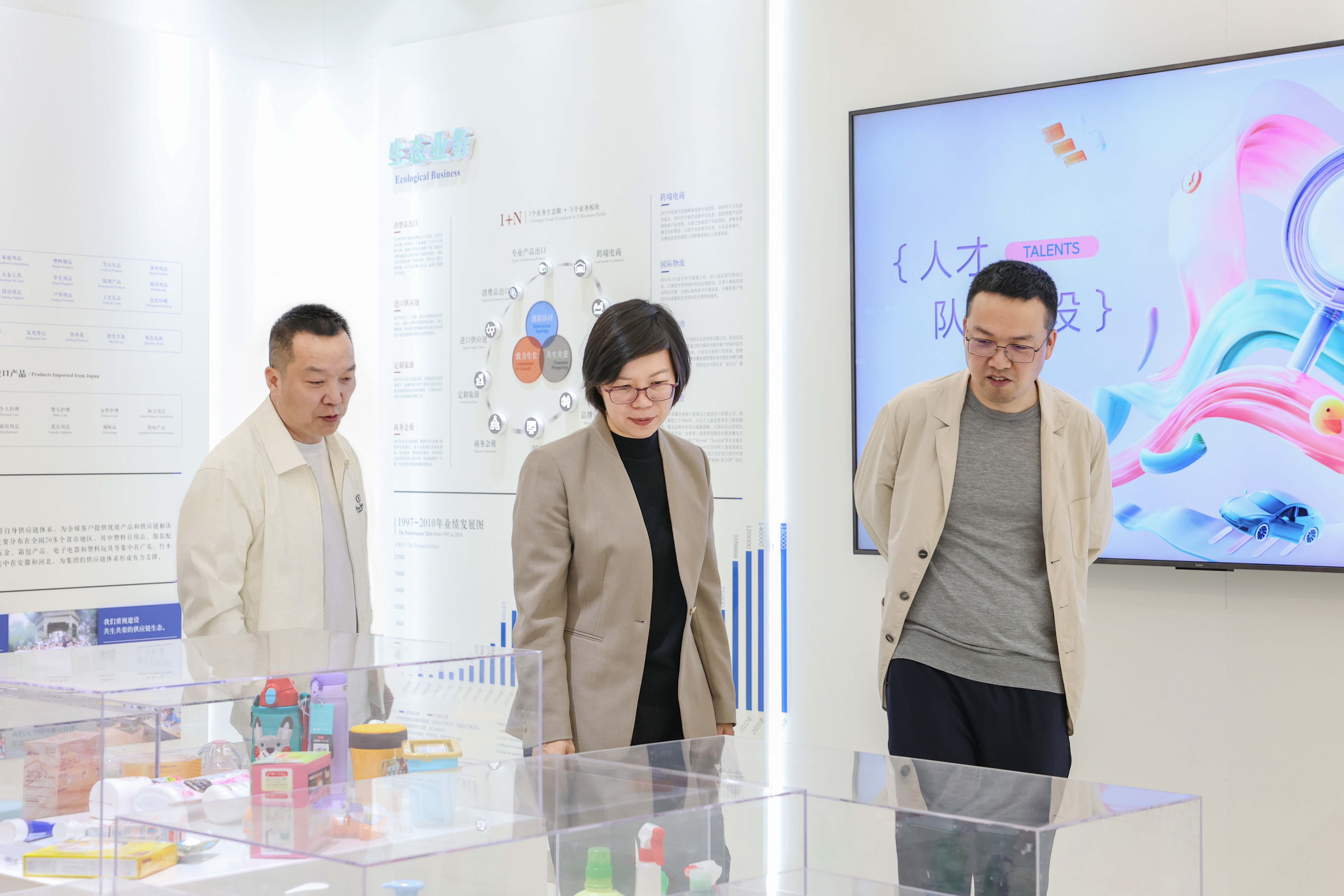 调研领导一行参观了赛尔企业文化展厅,方保军总经理介绍了集团在构建发展一般贸易、跨境电商、生态圈布局三条赛道中的运营情况。