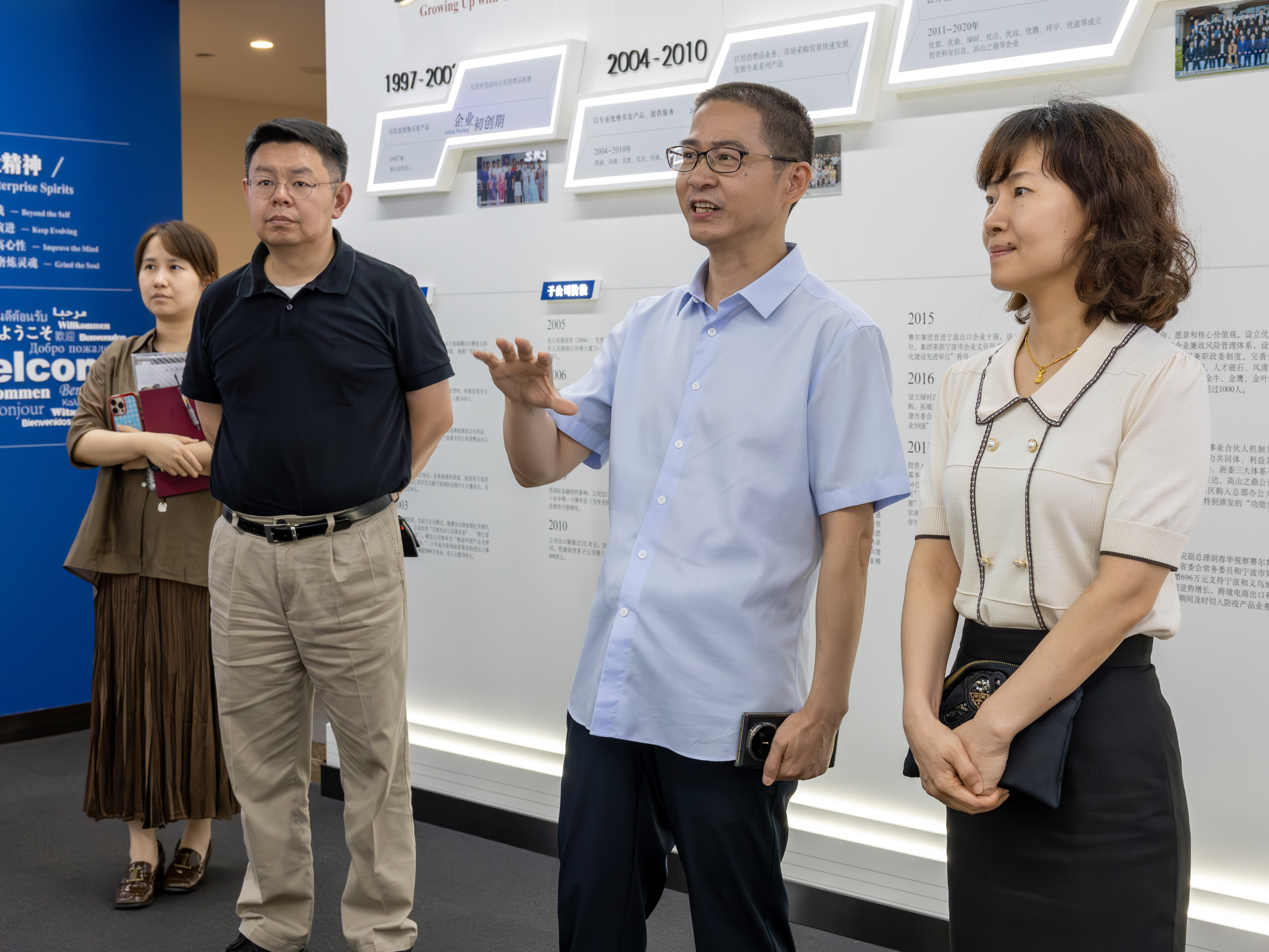 在赛尔集团企业文化展厅,徐平炬董事长向来访领导介绍了集团自1997年成立以来的发展历程、业务板块及企业文化建设情况。他表示,经过二十多年的发展,赛尔已成长为创新驱动的外贸集团。近年来持续深化外贸生态圈布局,打造独具特色的企业文化,为业务创新发展奠定了坚实基础。