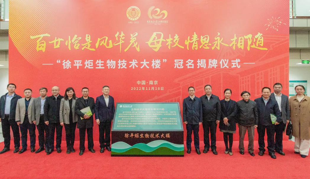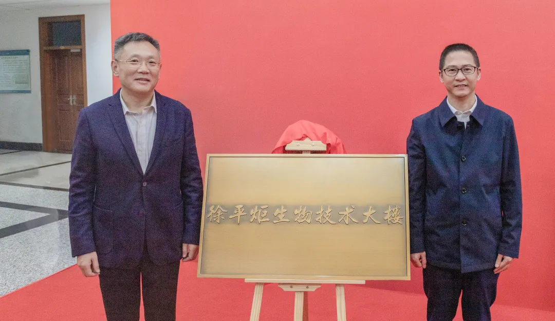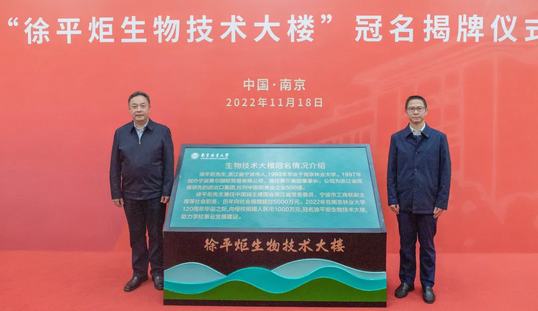 为感谢徐平炬校友对母校的深情厚意,学校决定将生物技术大楼冠名为“徐平炬生物技术大楼”,徐平炬董事长和赵茂程书记共同为“徐平炬生物技术大楼”揭牌。生物技术大楼建成于2004年,坐落于校园中部教学区,樱花大道南端。学校林木遗传与生物技术教育部重点实验室、国家林草局南方林木种子检测中心和南林大校史馆均位于此。这座大楼必将成为南京林业大学高层次科技人才聚集的高地,尖端科技科研成果诞生的摇篮,意义重大且影响深远。随后与会领导和嘉宾参观了南林大校史馆。