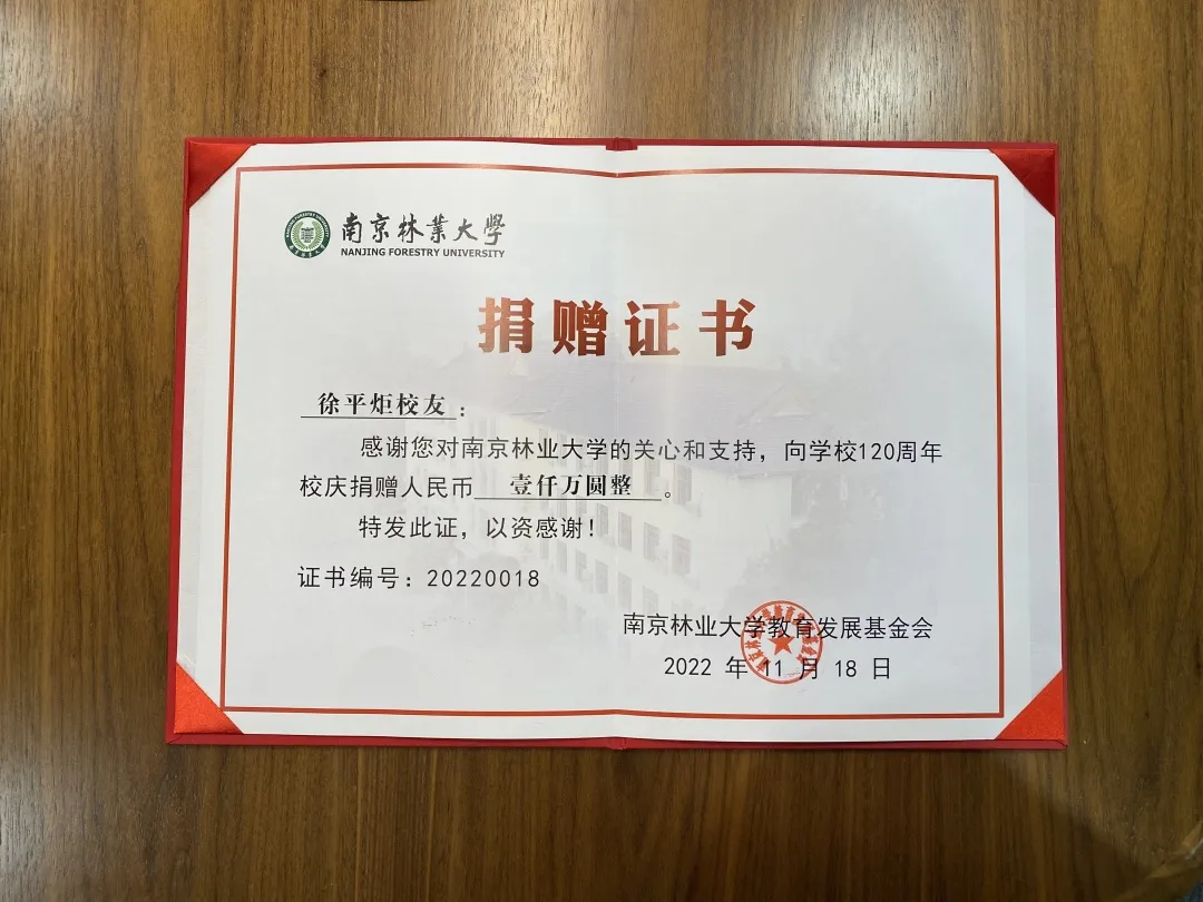 诚朴雄伟两甲子,树木树人双一流。2022年10月,南京林业大学迎来120周年华诞,徐平炬董事长11月17日前往南京,参加南林大120周年校庆系列活动。校庆之际徐平炬个人向母校捐赠1000万元助力学校事业发展,捐赠仪式之前,资金已经到账南林大教育基金会。