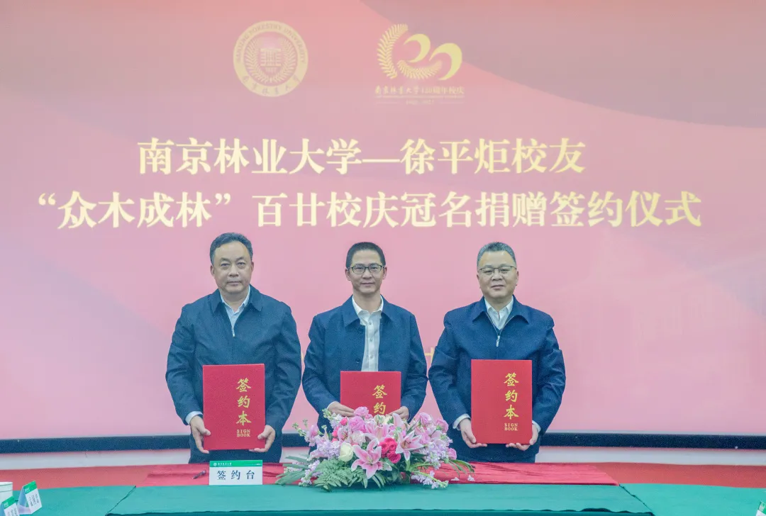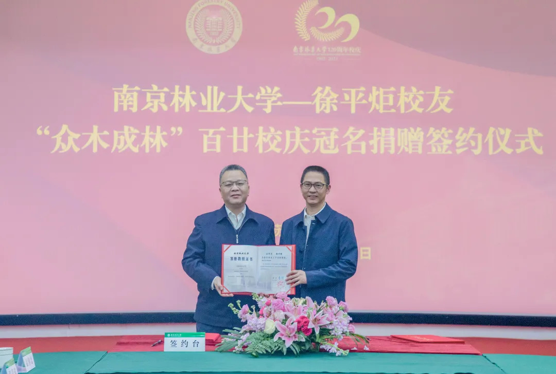 徐平炬董事长、勇强校长和刘中亮副书记分别代表捐赠方、受捐方和接受方共同签署“众木成林”百廿校庆冠名捐赠协议。赵茂程书记为徐平炬校友颁发捐赠证书和纪念牌。南京林业大学聘请徐平炬校友担任经济管理学院客座教授并颁发聘书。