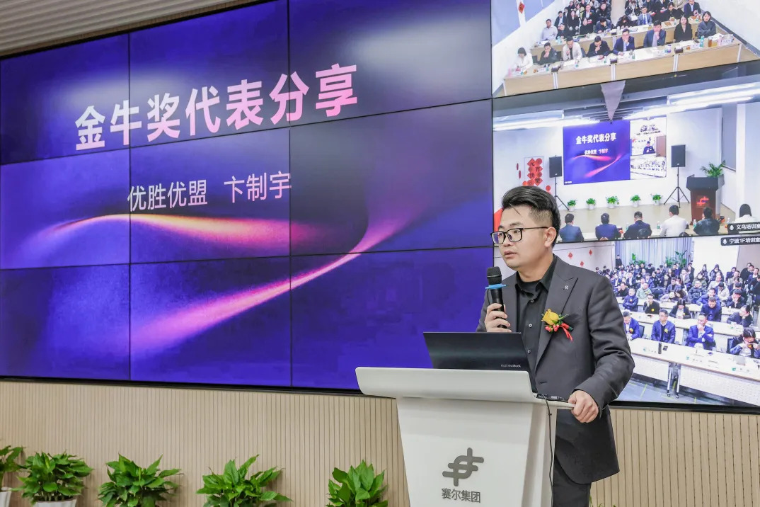 金牛奖代表优胜优盟卞制宇、优腾公司马芸媛上台分享。卞制宇表示,能够顺利完成年度业绩目标,主要基于团队对业务数据高度敏感,发现问题即时动态处理,坚持围绕业务质量提升的执行策略,以及团队成员齐心协力作用。马芸媛表示,获得金牛奖是整个团队支持力量体现。建议业务部门更多聚焦目标市场,坚持二八原则加大重点客户服务力度,通过以老带新的方式加快新人融入,从而迅速提高业务团队执行能力。