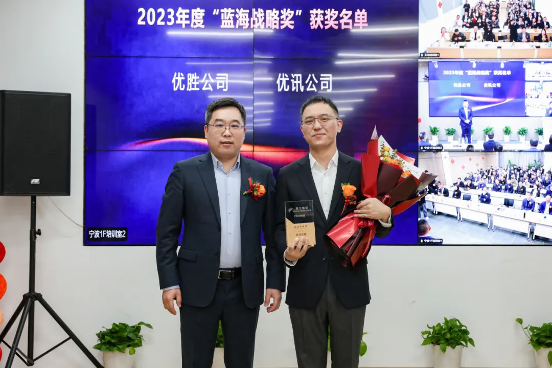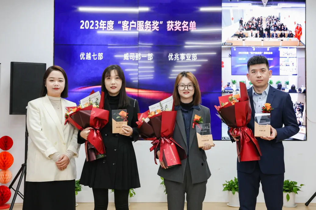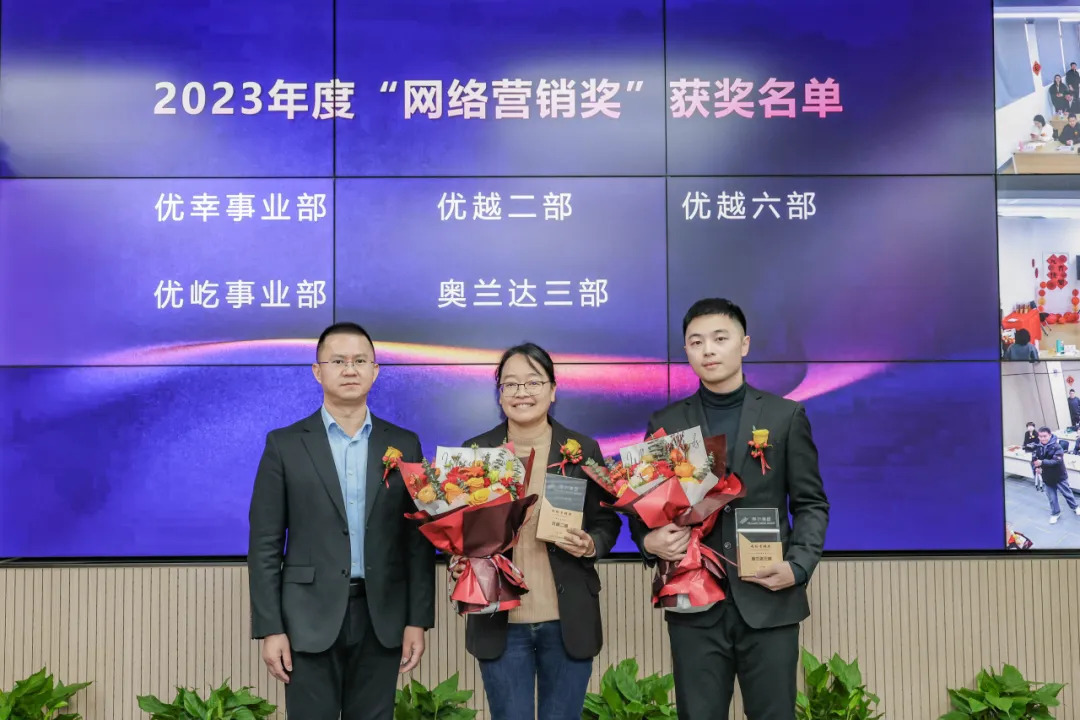 会议举行年度重要奖项颁奖仪式。23年度集团设立集体奖项7个,优景公司荣获文化建设奖和学习组织奖,优腾公司荣获协同共享奖和清廉建设奖,优越公司荣获创新活力奖,优远公司荣获人才磁石奖,集团单证风控部荣获信息安全奖。23年集团设立团队奖项6个,分别是蓝海战略奖、市场开拓奖、业绩倍增奖、业务质量奖、网络营销奖和客户服务奖,共有21个业务团队获得奖项荣誉。蓝海战略奖由优胜公司和优讯公司获得,该奖项要求对新业态模式敏感,业务布局前瞻性强,有示范性新项目落地成功,公司业务布局成为集团重要业务赛道之一,陈勇珍和钱天锋分别代表各自公司领取蓝海战略奖,所获荣誉实至名归。23年度陈勇珍、钱天锋、王建、徐生科等四位业务总经理获得个人奖项的最高荣誉金鼎奖,该奖项历来以竞争激烈著称,四位获奖者凭借着业务规模、高速增长和盈利能力摘得金鼎桂冠。2023年度共有20位业务负责人凭借部门优秀业绩,荣获个人金牛奖项并现场上台领奖。