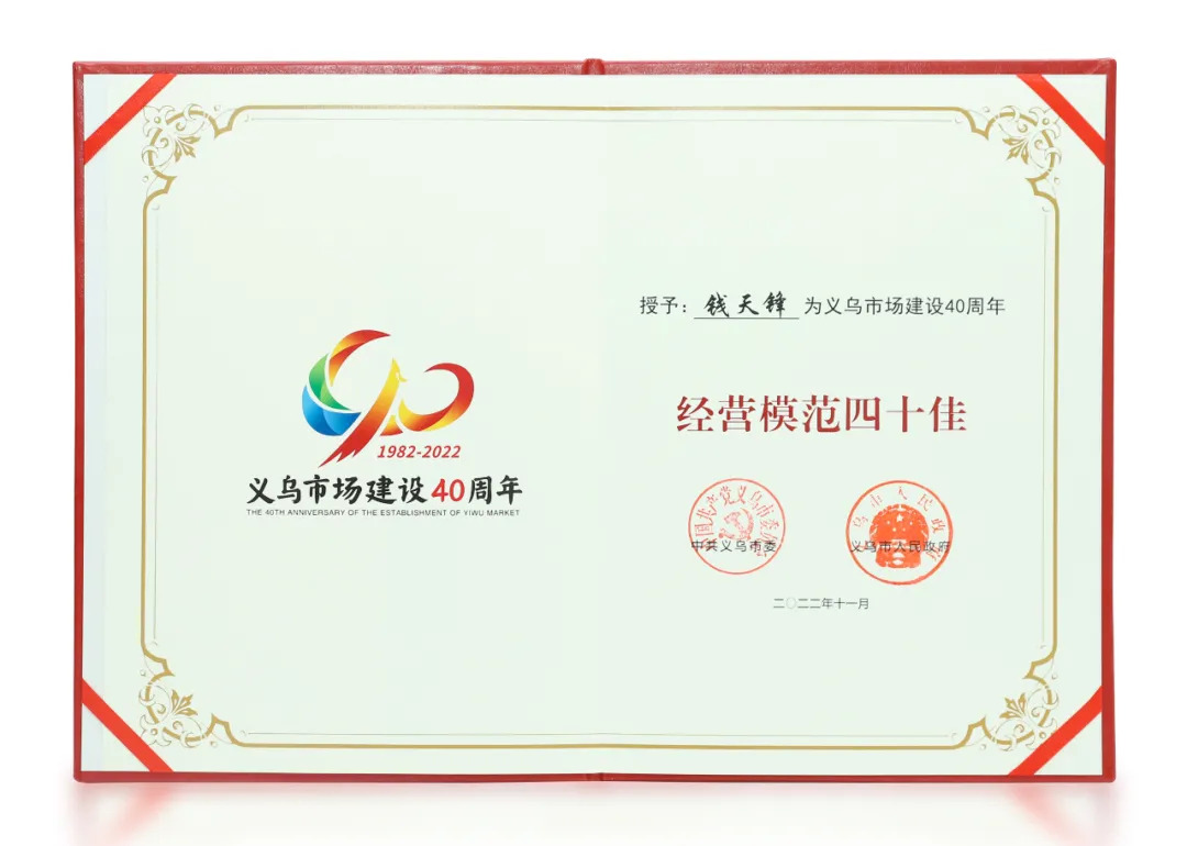 17年,与义乌市场互相成就——钱天锋副董事长荣获义乌市场建设40周年“经营模范四十佳”
