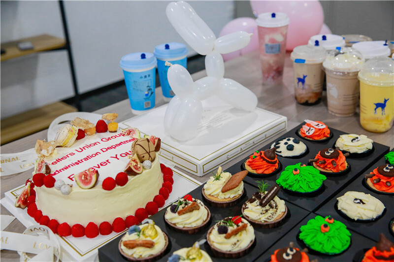 粉色气球以花朵形状铺设在会议桌四角,可爱的乳白色小狗灵巧地立在蛋糕上,颜值超高的万圣节纸杯蛋糕围绕在四周,20杯瑞幸咖啡摆设成“love”的造型,象征着亲如一家的综合行政部全体成员。