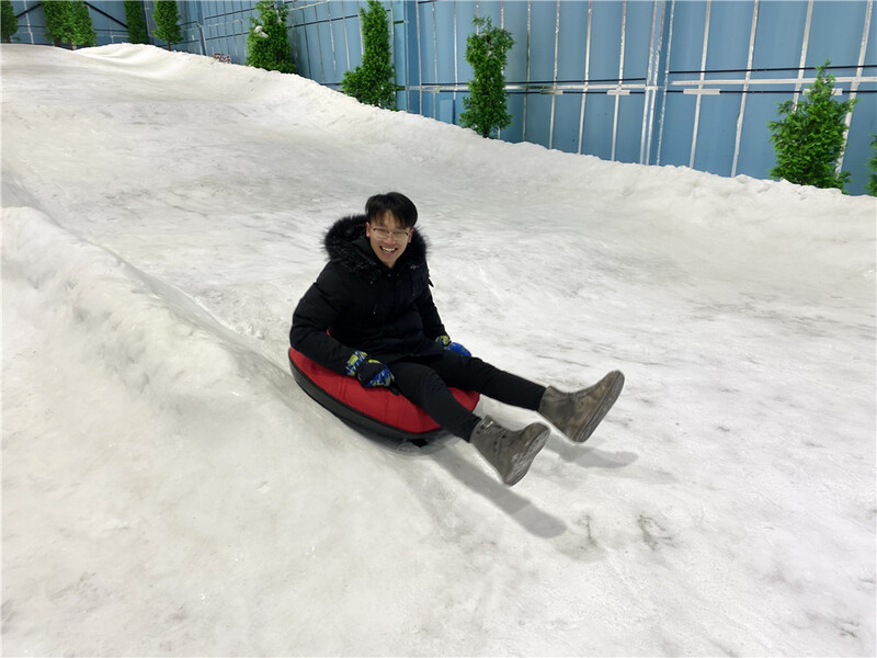 我们早早地驱车前往团建的第一站——爱上义乌的夜。考虑到大家的参与性,我们一致选择滑雪项目。每个人都兴冲冲地牵着“座驾”走上滑雪道的起点,伴随着兴奋又害怕的尖叫声冲下滑道。除了滑雪之外,当然还得打一场雪仗才不虚此行。