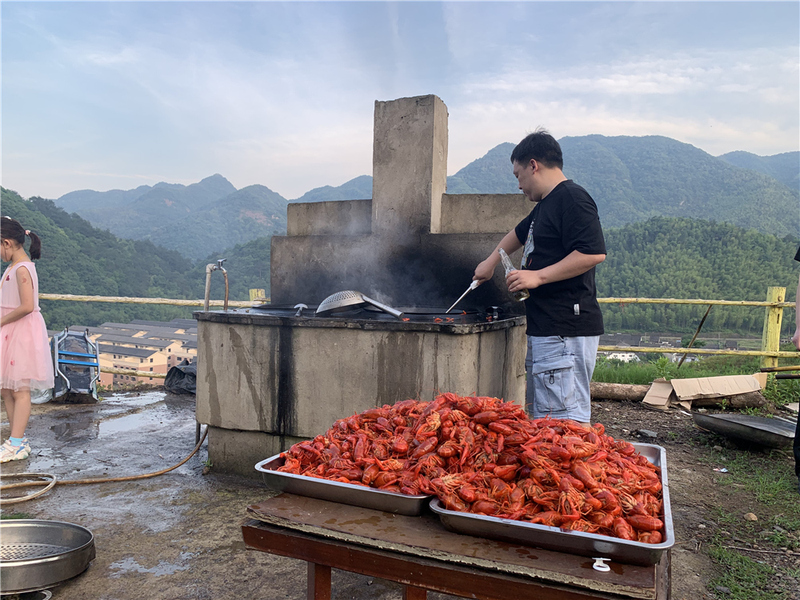 在做了一些简单的破冰游戏后,太阳也快下山了,大家搬来100斤的龙虾、60斤的牛蛙和三大箱的烧烤食材,开始为晚宴而忙碌着。很快,炉火烧旺,青烟袅袅,油刷不断地在烤架上来回穿梭,像是一位舞者,尽情展示香甜美味。圆鼓鼓的热狗在烤架滚烫中,爆出阵阵诱人香味,再撒上孜然粉更是让人垂涎欲滴。大家喝着啤酒,吃着肉,享受着这一刻的欢喜。