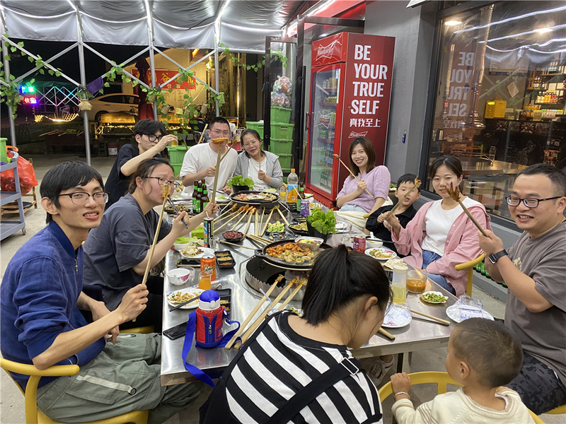 晚上,我们在民宿附近的烧烤店解决了晚餐,点了一桌美食,同事们抛开工作中生活中的烦恼,畅聊了起来。