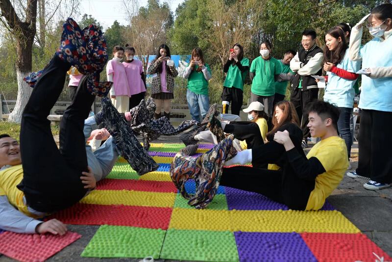 偌大的场地,缤纷的游戏,指压板、撕名牌等综艺中能看到的游戏应有尽有,同事们奉献一场精彩的“奔跑吧”决战。大家通过抽取名牌的方式随机分成4组,熟悉组员后便开始激烈的游戏。首先进行指压板上穿花裤和计步器跳舞,每支队伍在指压板上合格地穿上花裤尽情跳舞,最后凭借计步器上的最终数字确定胜者。指压板上,大伙儿瞬间贡献出无数个表情包,引得周边群众一片笑声。爱的魔力转圈圈中,要求队伍在不用手的情况下,将缠绕在身上的布条转移到下一名队员身上,用时最短的队伍获胜。随后进行的音乐竞跑和丛林冒险环节里,几支队伍互有胜负,不相上下。