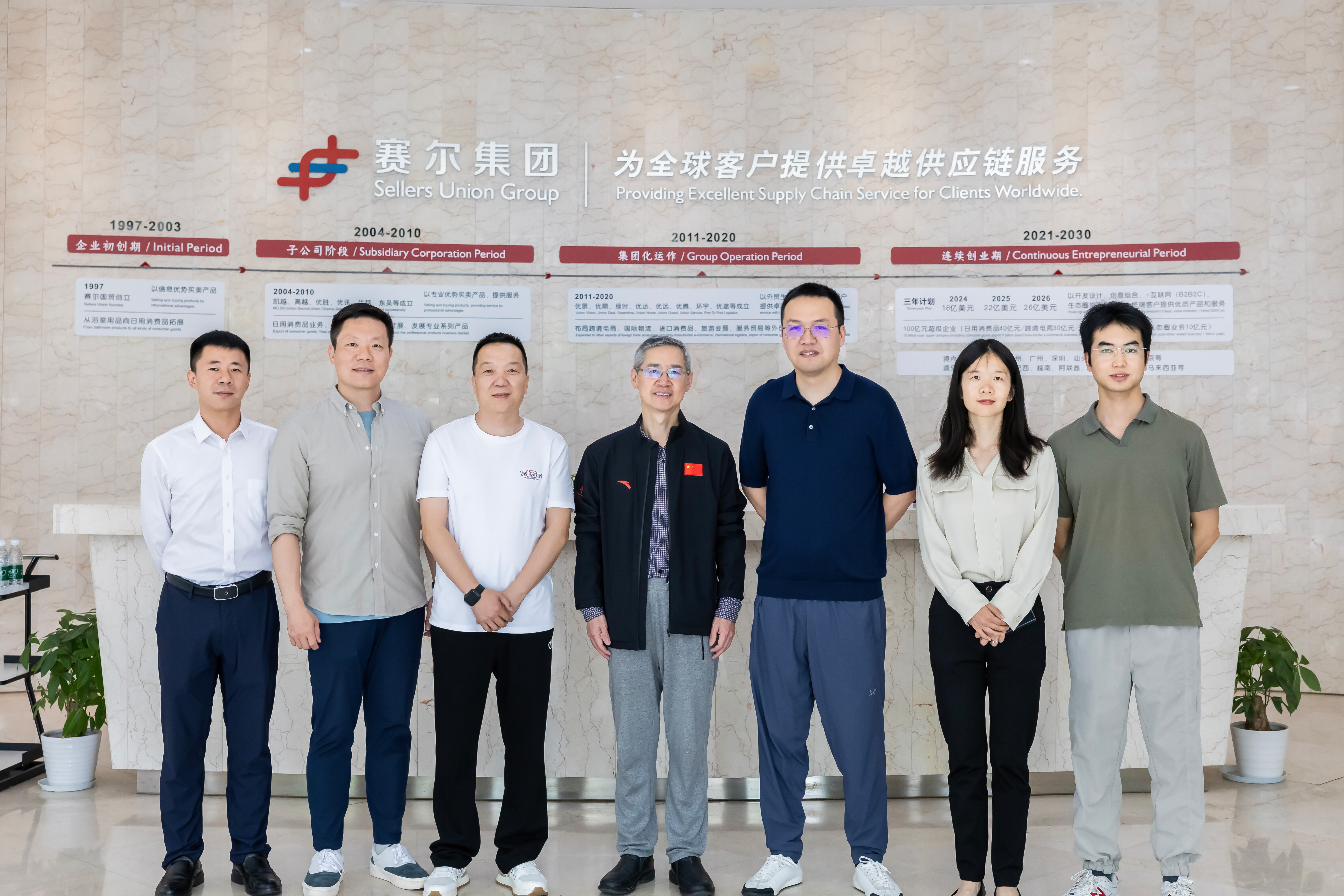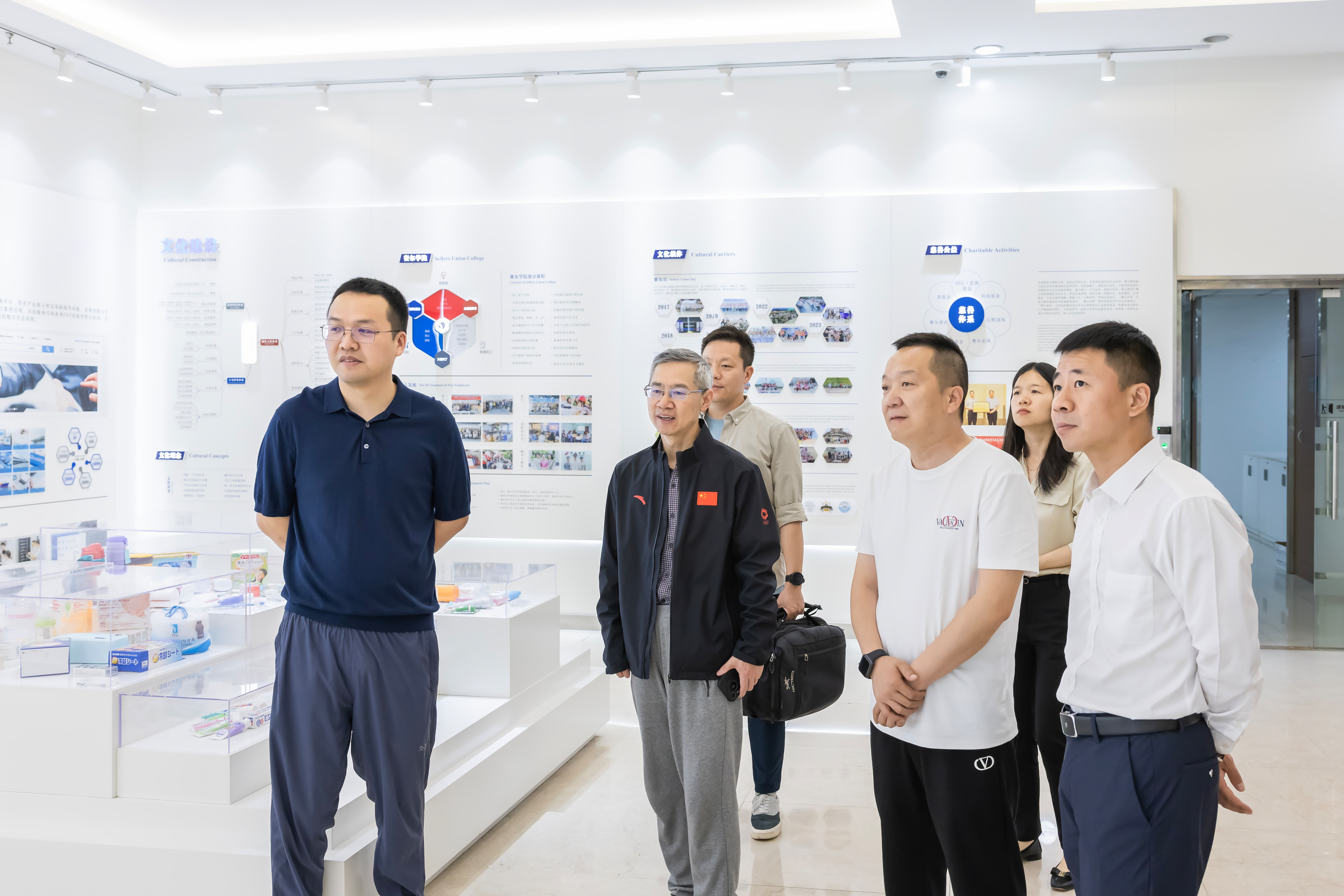 曾花城副局长一行参观了集团企业文化展厅,深入了解集团全球化布局及客户演进历程。方保军总经理详细介绍了集团从传统港澳台贸易代理到深耕国际大型商超渠道,再到触达C端消费者,实现从“中端”到“终端”的演进之路。曾花城副局长对赛尔集团立足义乌、链接全球的贸易版图给予充分肯定。