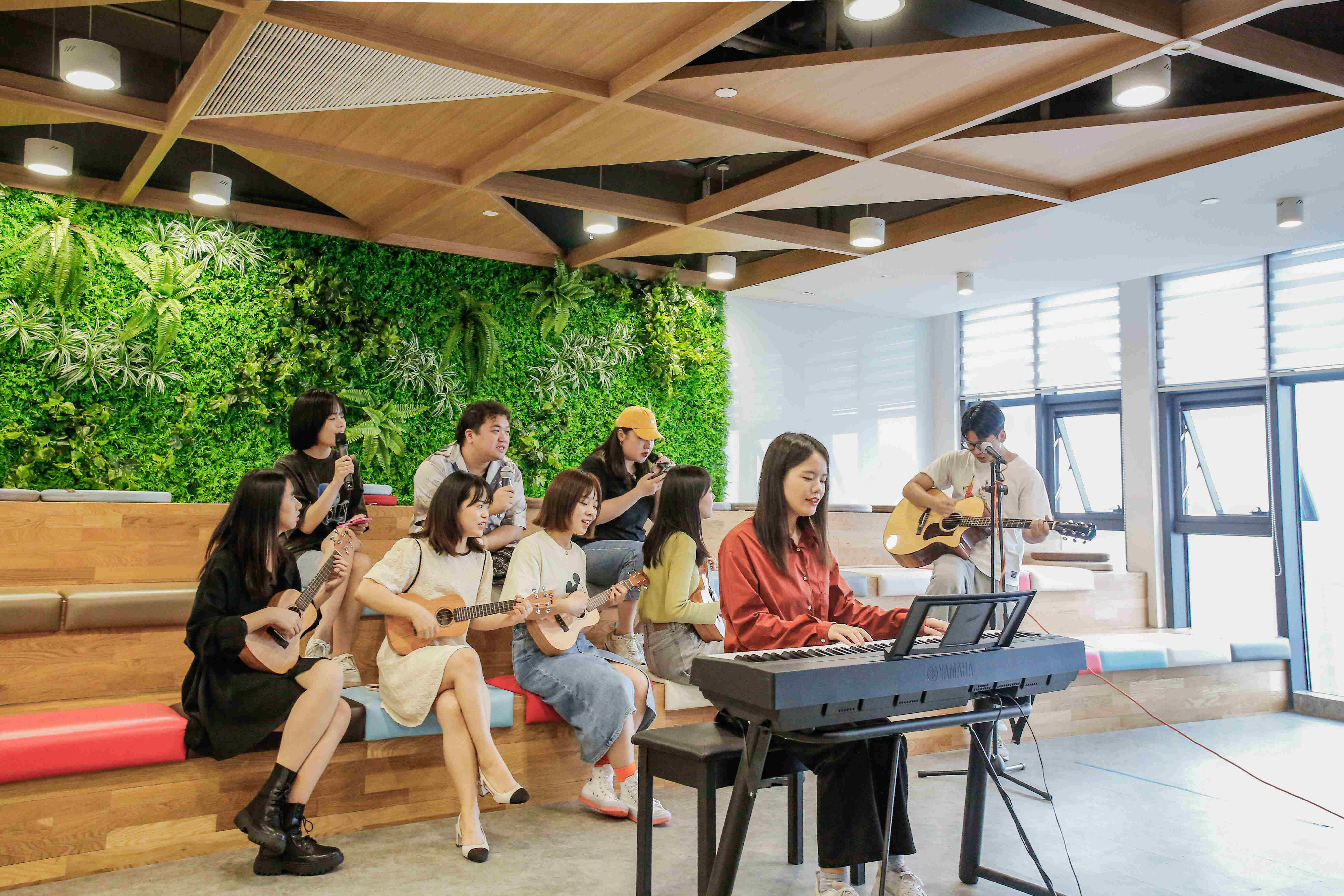 音乐社拥有一批擅长乐器、热爱音乐的社员,已经开展了线上K歌大赛、声乐课、天台音乐会、折叠钢琴课程等活动。此次草坪音乐会上,多才多艺的爱乐社员们为员工献上一场精彩的音乐会。让音乐疗愈你的心情、装饰你的生活。